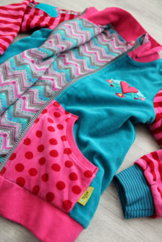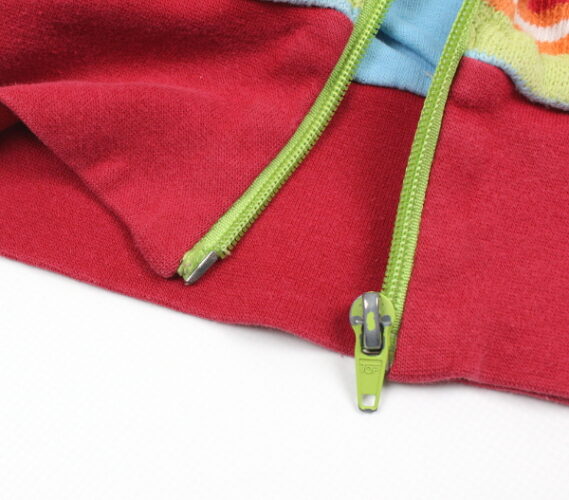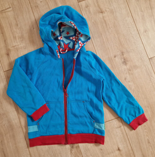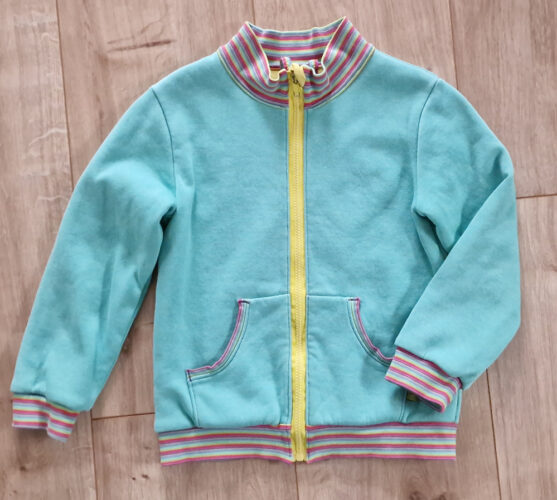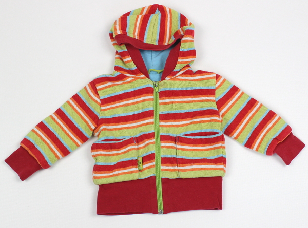 Gr. 80 Strickjäckchen aus Baumwollstrick/French Terry. Leider ist der Reißverschluss unten ausgefranst und lässt sich schwer einfädeln, daher geschenkt dazu
