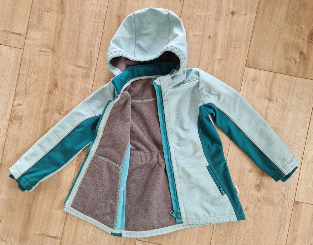 Gr. 128 Softshelljacke (reflektierender Stoff) mit abknöpfbarer Kapuze, innen Fleece, 15 € -- https://www.olilu.de/2023/03/mit-dieser-softshelljacke-wird-das-kind-gesehen/