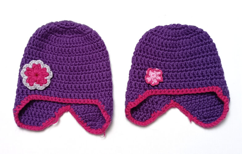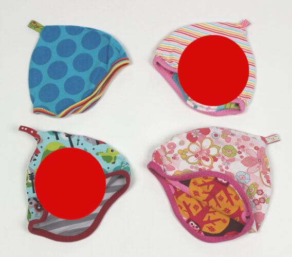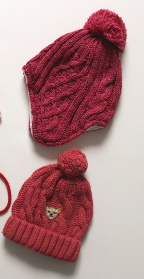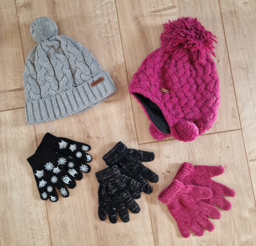 M52: graue Strickmütze mit Jerseyfutter, 100 % BW, KU 50, 2 € - M53: pinke Strickmütze Acryl/Wolle mit Teilfutter (Polyester), KU 51, 1 € - Handschuhe, Größe ca. 4-7 Jahre: M54: Halloween, M55: Glitzer, M56: Chenille, alle geschenkt dazu